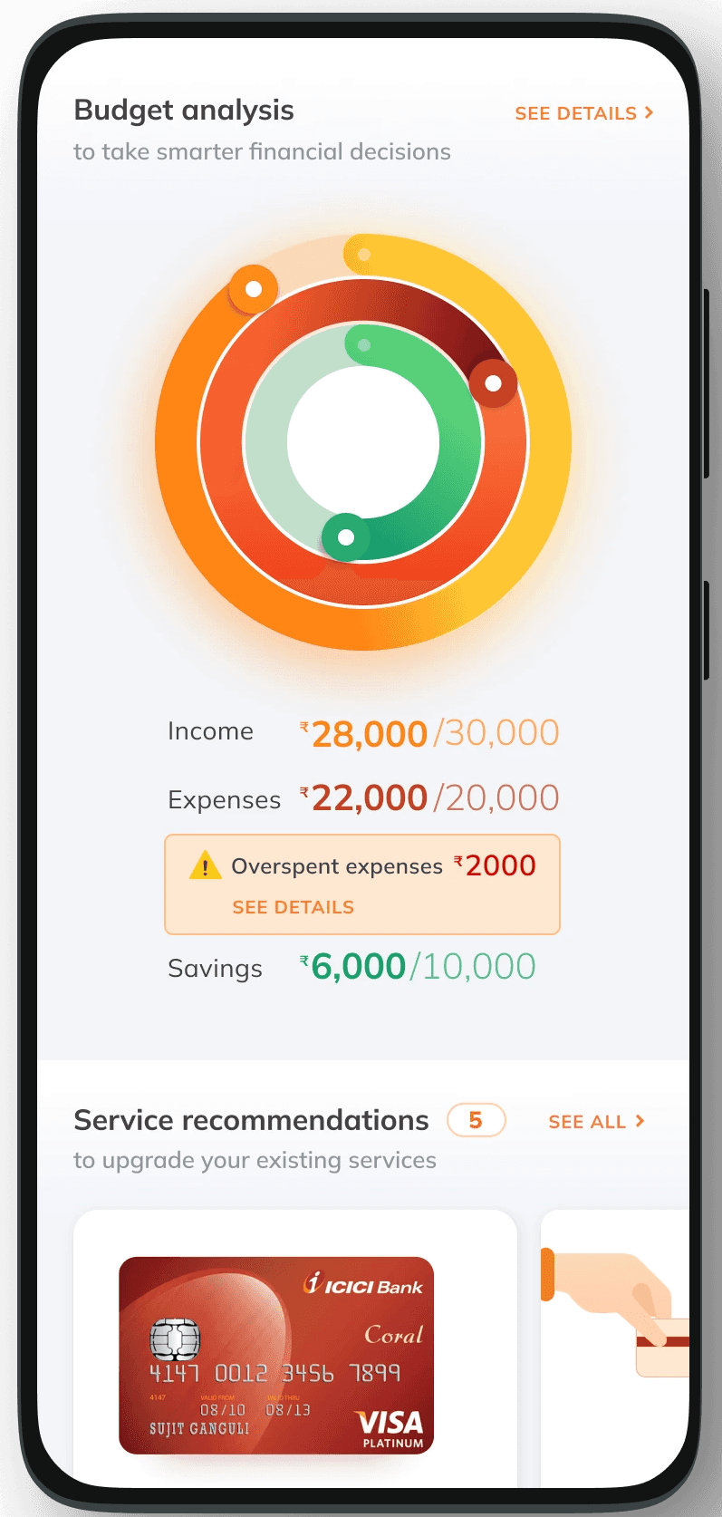 The homepage of discover is split between, user’s financial strength, their budget analysis and recommendations of products that would help them be better at their finances.